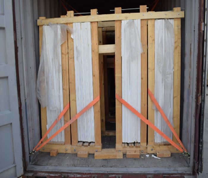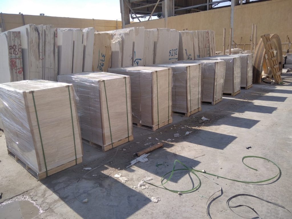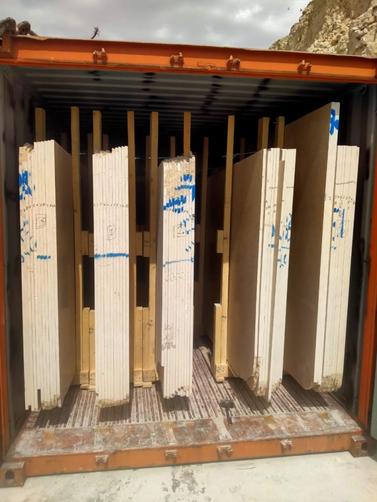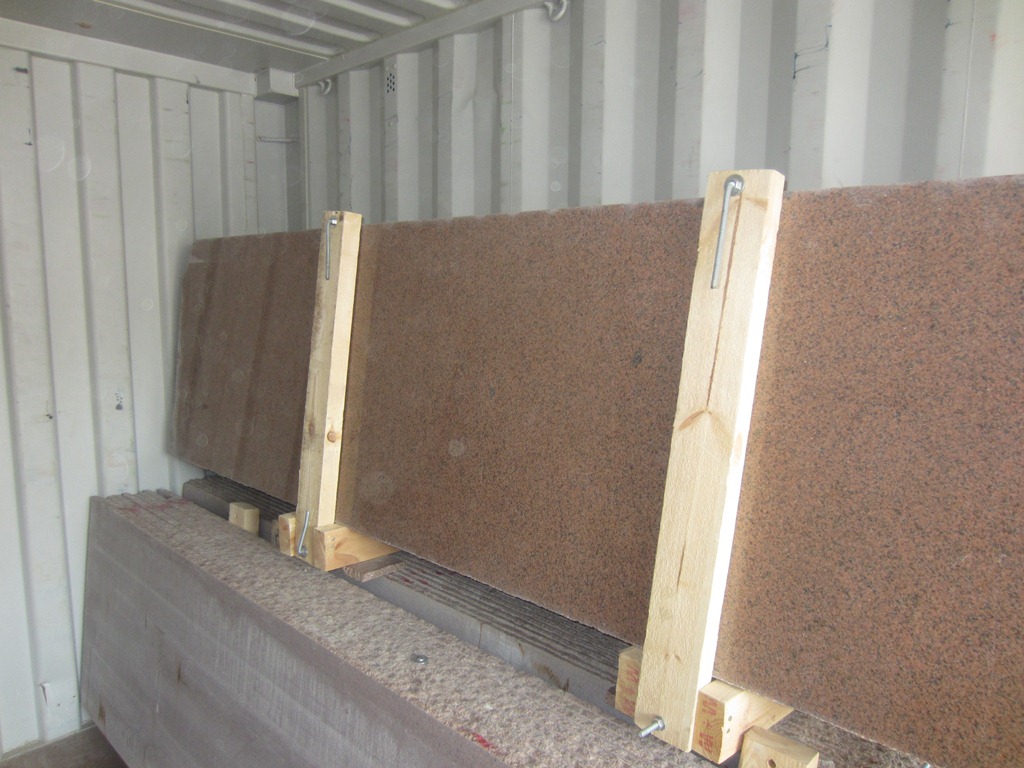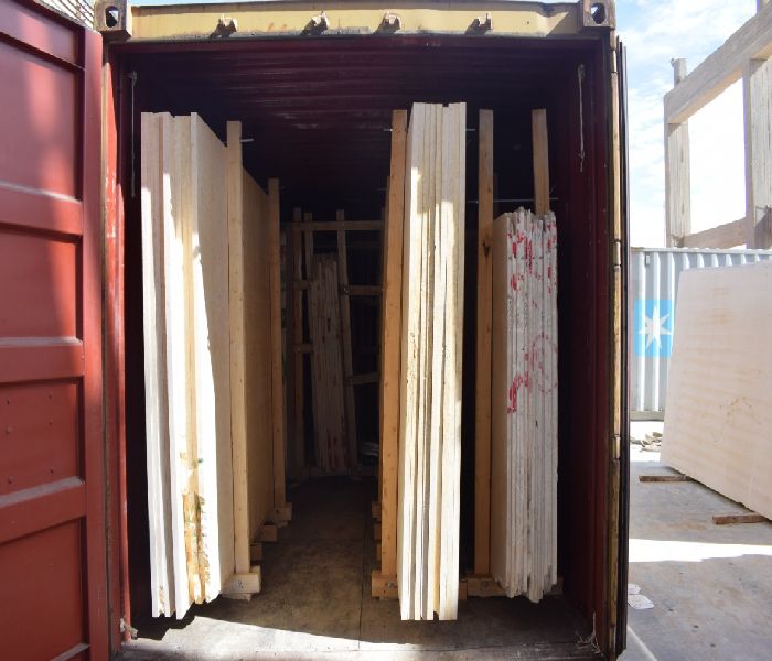 The slabs are gathered in groups each group contains form 8 to 15 slabs according to their thickness packed in wooded bundles & Loaded either in 20 feet box container or in open container. In case of polished slabs we put Plastic sheets between slabs to protect it against scratches., if the slabs are long in length so the container take only two groups one to the right and the other to the left, if the slabs are short in length so the container take four group of slabs two to the right and two to the left.